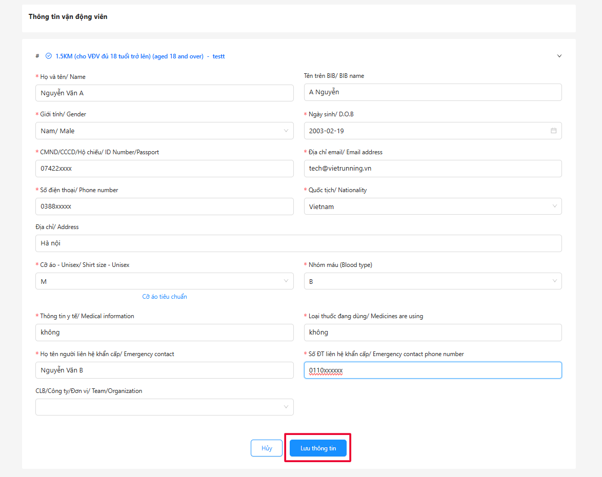 Đảm bảo điền đầy đủ tất cả các trường thông tin bắt buộc (được đánh dấu sao đỏ).